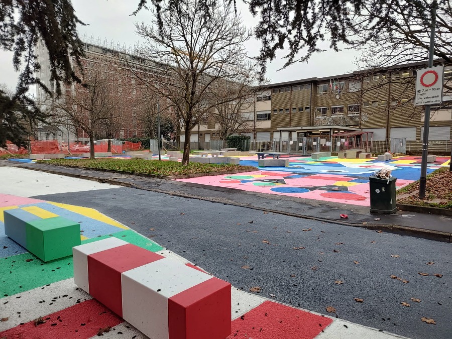 Il progetto di via De Nicola, supportato anche finanziariamente da Netflix Services Italy S.r.l., firmatario del patto di collaborazione, ha pedonalizzato l’area antistante l'ingresso dell'ICS Sant’Ambrogio e lo ha trasformato grazie alla posa di arredi e tavoli da ping pong e da pic nic, piante in vaso e colorazione del manto stradale. Ora la nuova “piazza” è uno spazio pubblico fruibile e sicuro non solo per gli studenti, ma per tutto il quartiere.